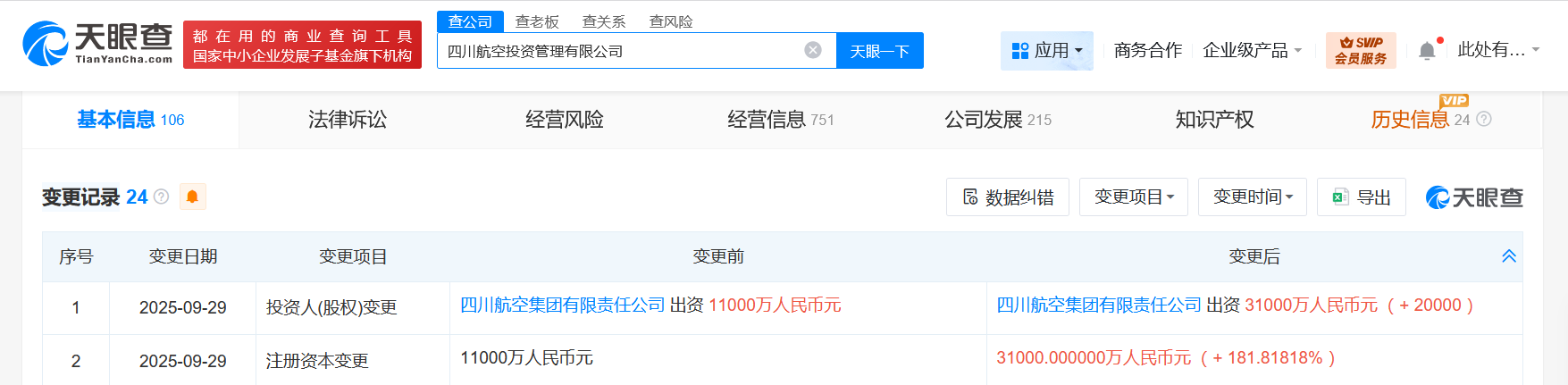 雷达财经讯,天眼查App显示,近日,四川航空投资管理有限公司发生工商变更,注册资本由1.1亿人民币增至3.1亿人民币,增幅约182%。