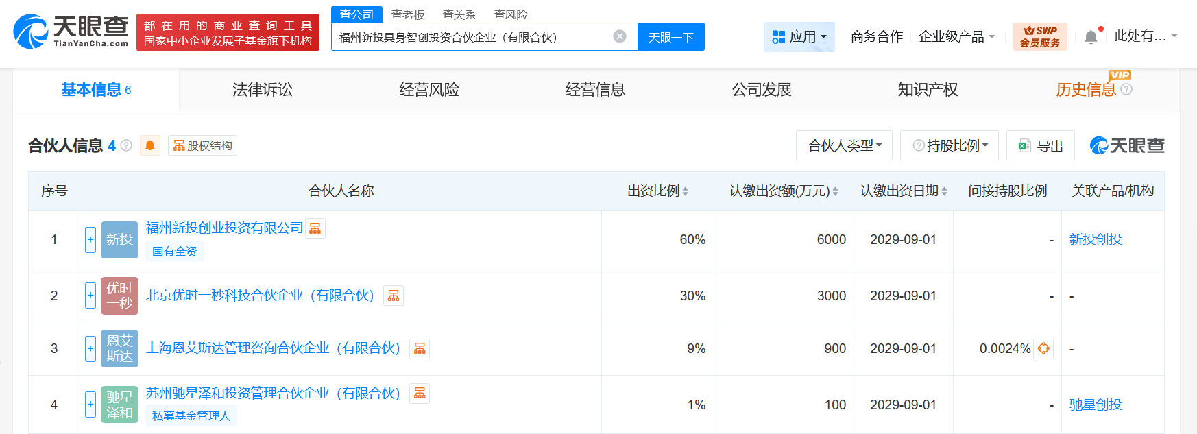 雷达财经讯,天眼查App显示,近日,福州新投具身智创投资合伙企业(有限合伙)成立,执行事务合伙人为苏州驰星泽和投资管理合伙企业(有限合伙),出资额1亿人民币,经营范围为以私募基金从事股权投资、投资管理、资产管理等活动。合伙人信息显示,该企业由福州新投创业投资有限公司、北京优时一秒科技合伙企业(有限合伙)、上海恩艾斯达管理咨询合伙企业(有限合伙)等共同出资。