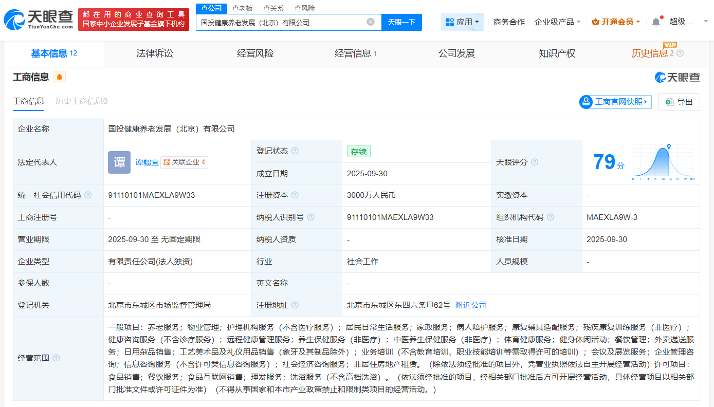 雷达财经讯,天眼查App显示,近日,国投健康养老发展(北京)有限公司成立,法定代表人为谭疆宜,注册资本3000万人民币,经营范围包括养老服务、物业管理、护理机构服务等,由国投健康产业投资有限公司全资持股。