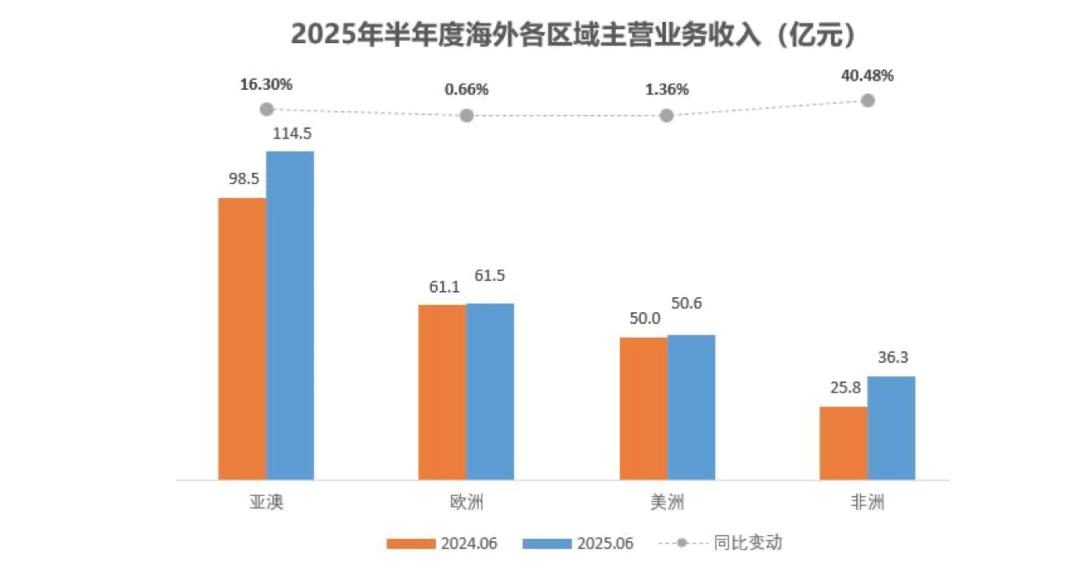 尽管海外市场已成为公司的营收主力,但区域发展不均衡问题突出。具体来看,上半年,亚澳区域实现销售收入114.55亿元,同比增长16.3%,占海外总销售收入的比重超四成;非洲区域实现销售收入36.3亿元,同比增长40.48%。
