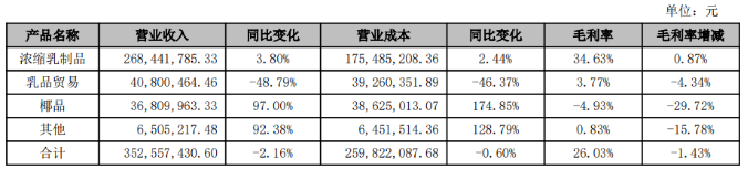 核心业务浓缩乳制品同样经营承压。2024年,公司浓缩乳制品实现营收5.85亿元,同比下滑10.06%,公司管理层称,2024年消费较弱,业绩面临一定的压力。今年上半年,浓缩乳制品实现营收同比小幅增长3.8%至2.68亿元,但各细分产品的表现呈现分化。