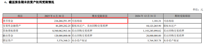 在资产权利受限方面,截至2025年6月30日,公司货币资金受限金额达2.16亿元,受限原因为司法冻结,而2024年末该科目受限金额仅为1181.31元。