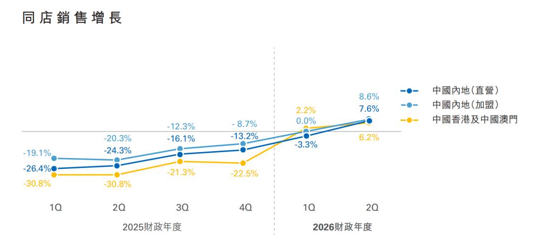 内地方面,直营店于季内的同店销售转为7.6%正增长,而加盟店的同店销售则增长8.6%,若撇除钟表业务,期内直营店的同店销售增长9.9%。