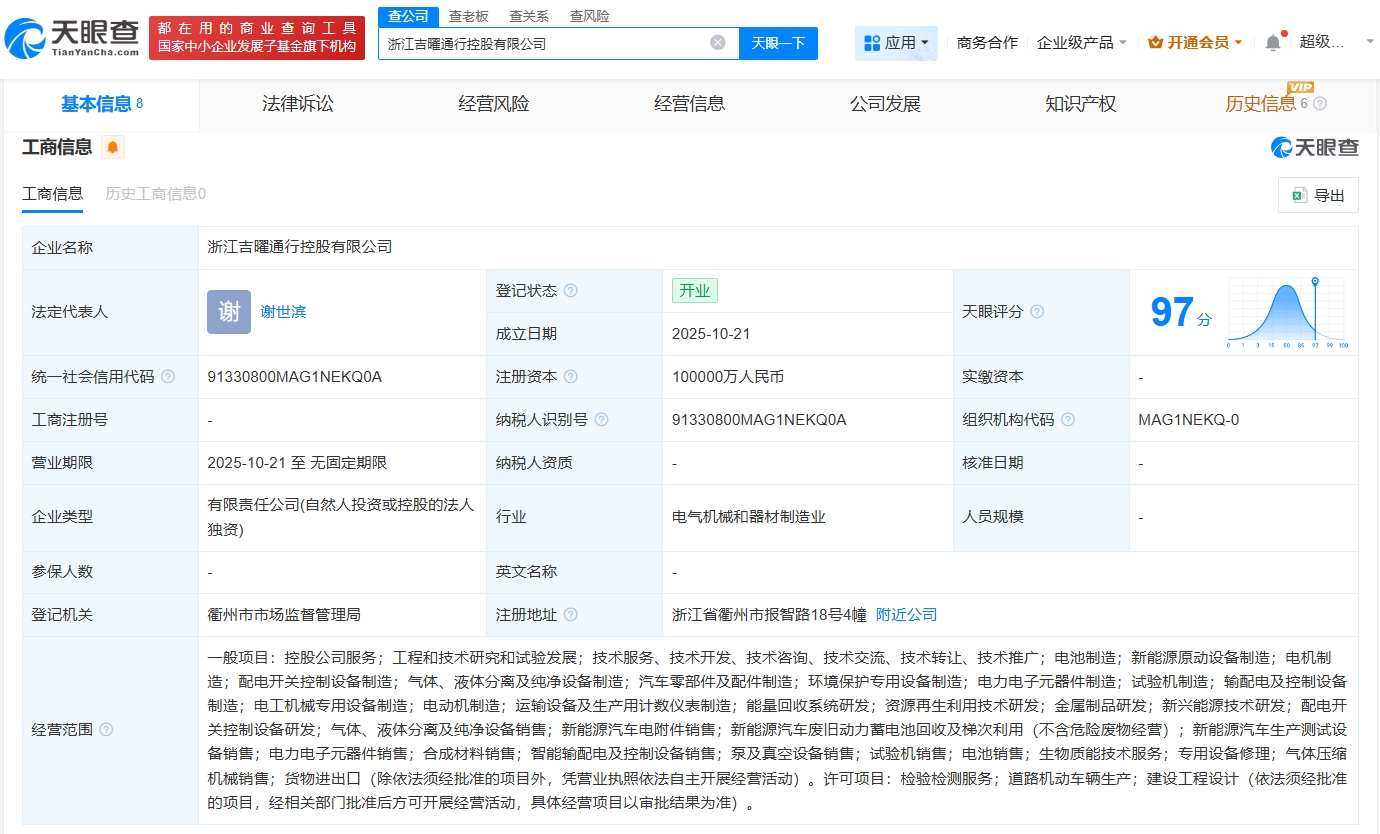 雷达财经讯,天眼查工商信息显示,近日,浙江吉曜通行控股有限公司成立,法定代表人为谢世滨,注册资本10亿人民币,经营范围包括工程和技术研究和试验发展、电池制造、电动机制造等。股东信息显示,该公司由浙江吉利产投控股有限公司全资持股。