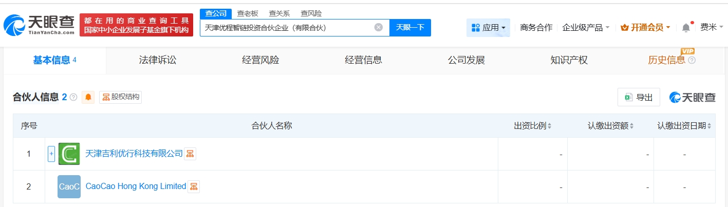 雷达财经讯,天眼查App显示,近日,天津优程智链投资合伙企业(有限合伙)成立,执行事务合伙人为天津吉利优行科技有限公司,出资额3500万人民币,经营范围包括以自有资金从事投资活动、自有资金投资的资产管理服务、信息系统集成服务等,由CaoCao Hong Kong Limited、曹操出行旗下天津吉利优行科技有限公司共同出资。