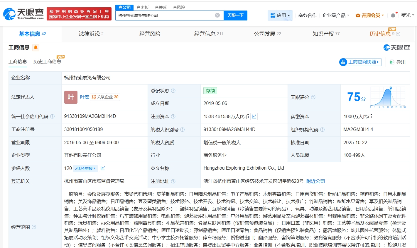 杭州探索展览有限公司成立于2019年5月,法定代表人为叶宏,经营范围包括会议及展览服务、市场营销策划、皮革制品销售等,现由三捷投资集团有限公司及上述新增股东共同持股。