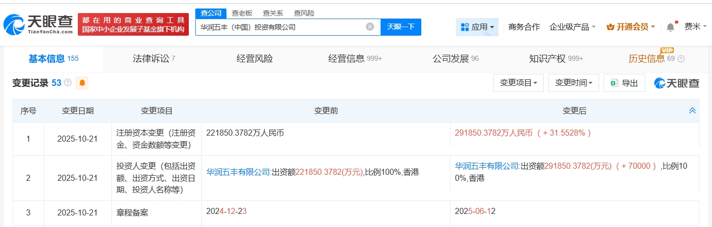 华润五丰中国投资公司增资至约29.2亿 增幅约32%
