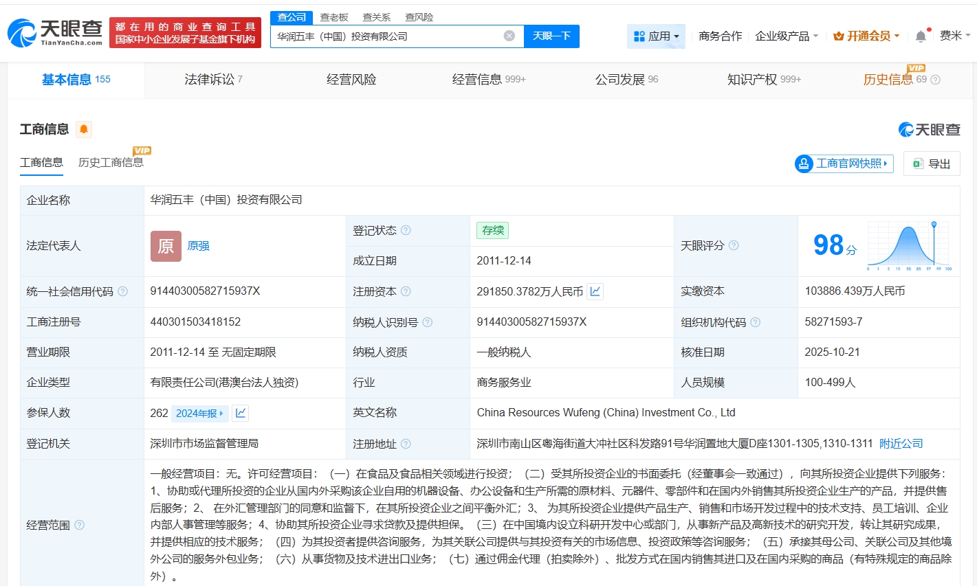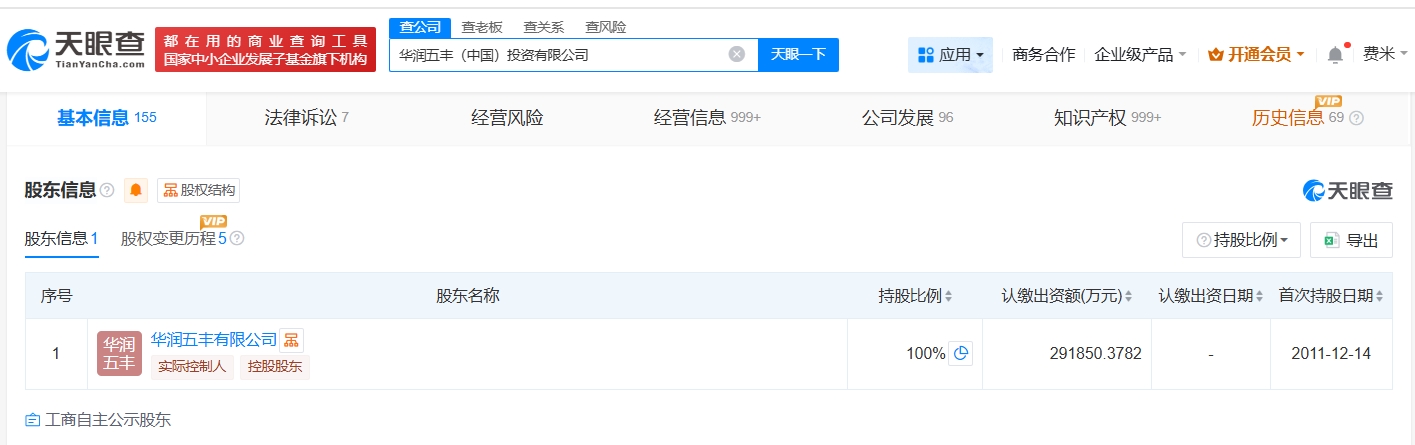 华润五丰(中国)投资有限公司成立于2011年12月,法定代表人为原强,经营范围包括在食品及食品相关领域进行投资、从事货物及技术进出口业务等。股东信息显示,该公司由华润五丰有限公司全资持股。