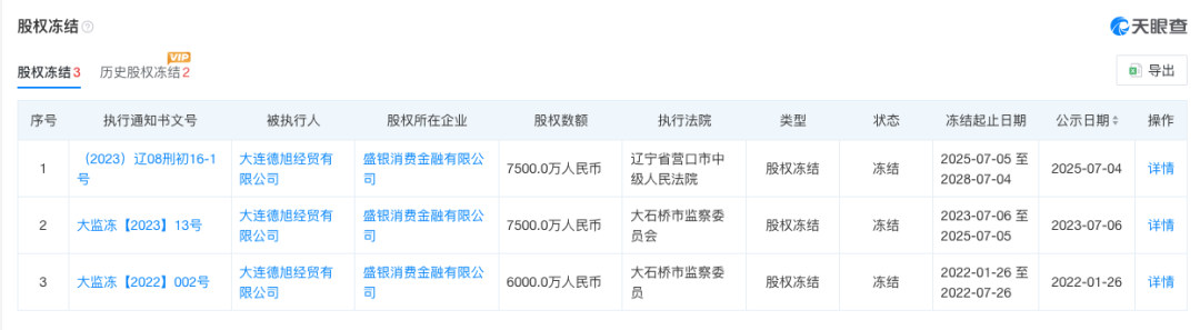 这已经是大连德旭经贸三年内第三次遭遇股权冻结。2022年1月,大连德旭经贸所持盛银消费金融6000万股权被冻结6个月;2023年7月,大连德旭经贸所持7500万股权又被冻结至2025年7月5日,如今再次被冻结。