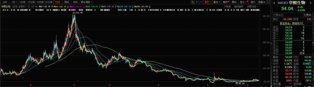 然而,至此之后,资本市场未能看到华熙生物的持续高增长,之后的股价一路震荡下跌。如今,每股已不足55元,市值跌至260.11亿元。