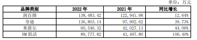 其中,润百颜年收入13.85亿元,同比增长12.64%,主打次抛修护精华,凭借“HA靶向修护技术”占据抗衰细分市场头部地位;夸迪收入13.68亿元,同比增长39.73%,以“CT50专利科技”为核心,聚焦抗老与次抛形态创新,成为继润百颜后第二个10亿级品牌;BM肌活收入8.98亿元,同比增长106.40%,凭借“糙米水”等爆品在油皮护肤赛道突围;米蓓尔收入6.05亿元,同比增长44.06%,主打敏感肌修复,通过“分级修护体系”强化品牌认知。