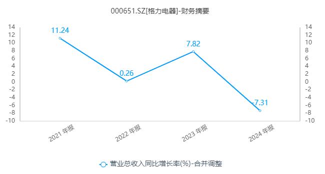 同花顺iFinD数据显示,2021年至2024年,格力分别录得营收1896.54亿元、1901.51亿元、2050.18亿元、1900.38亿元,同比增长率分别为11.24%、0.26%、7.82%、-7.31%。