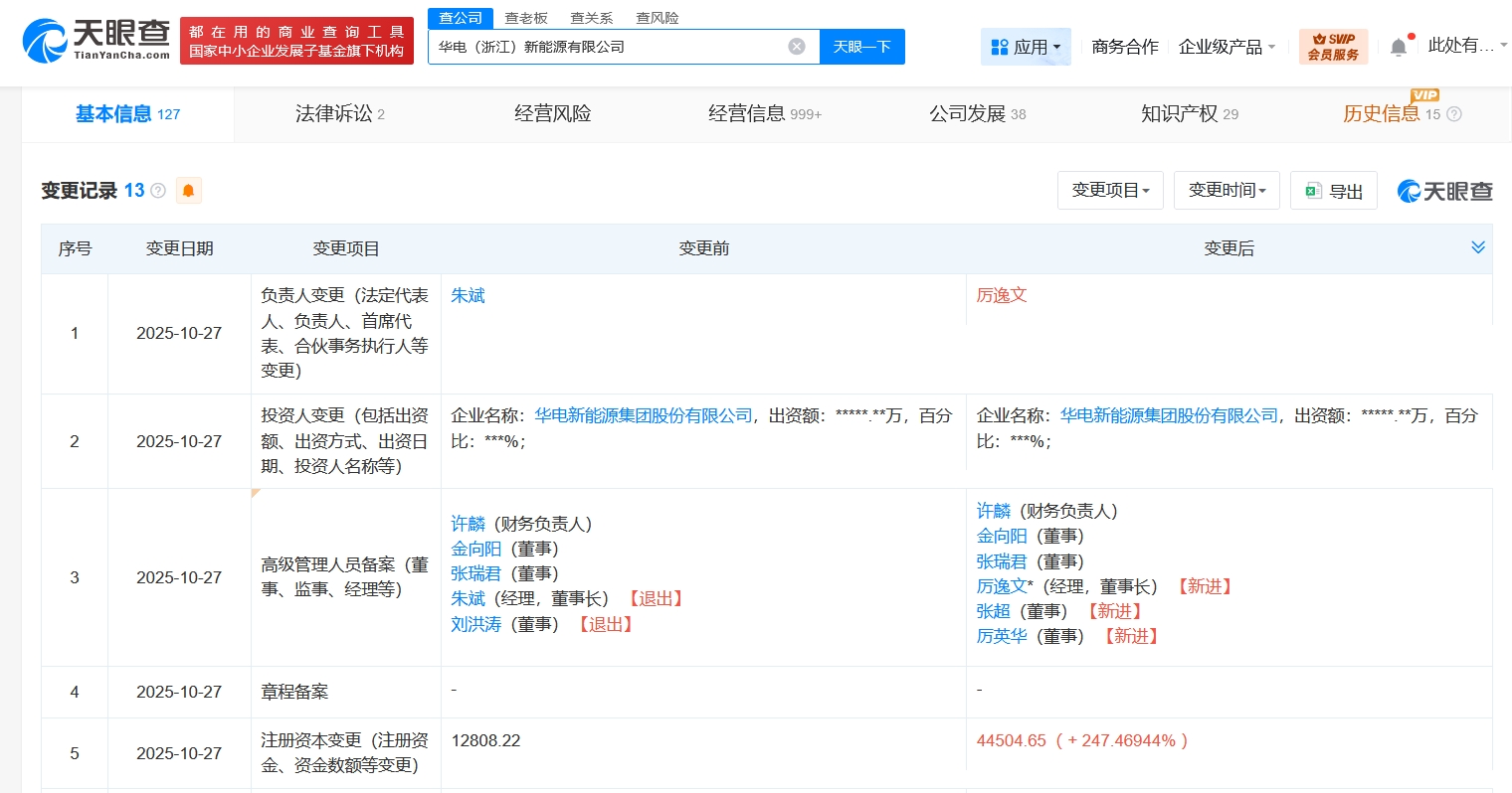 雷达财经讯,天眼查工商信息显示,近日,华电(浙江)新能源有限公司发生工商变更,注册资本由约1.28亿人民币增至约4.45亿人民币,增幅约247%,同时,多位主要人员发生变更。
