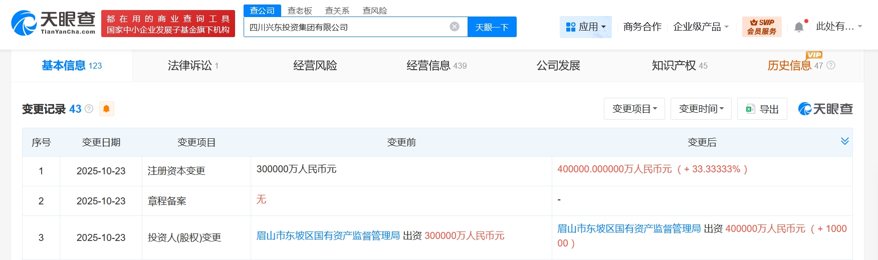 雷达财经讯,天眼查App显示,近日,四川兴东投资集团有限公司发生工商变更,注册资本由30亿人民币增至40亿人民币,增幅约33%。