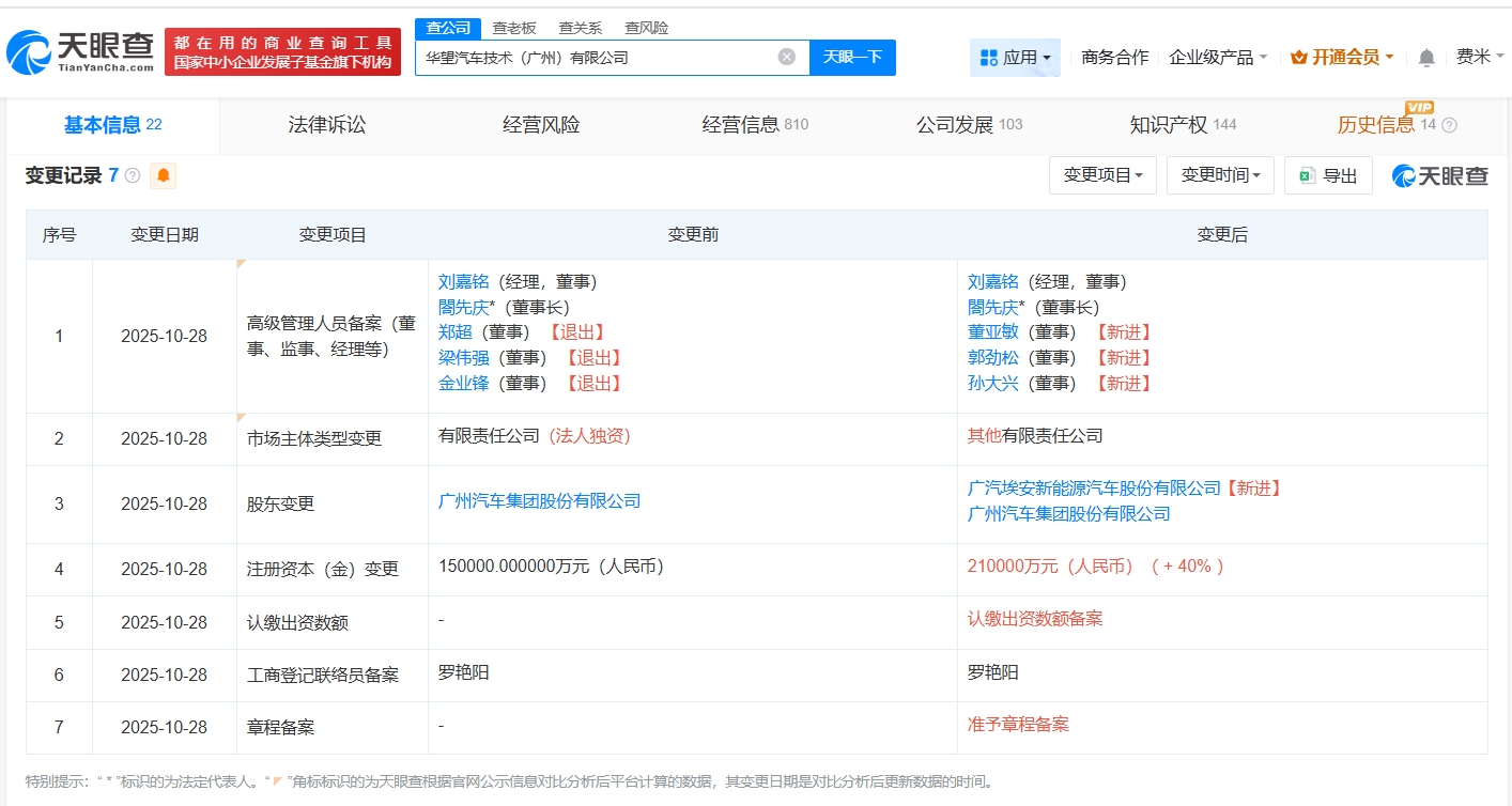 雷达财经讯,天眼查App显示,近日,华望汽车技术(广州)有限公司发生工商变更,新增广汽埃安新能源汽车股份有限公司为股东,注册资本由15亿人民币增至21亿人民币,增幅40%,同时多位高管发生变更。