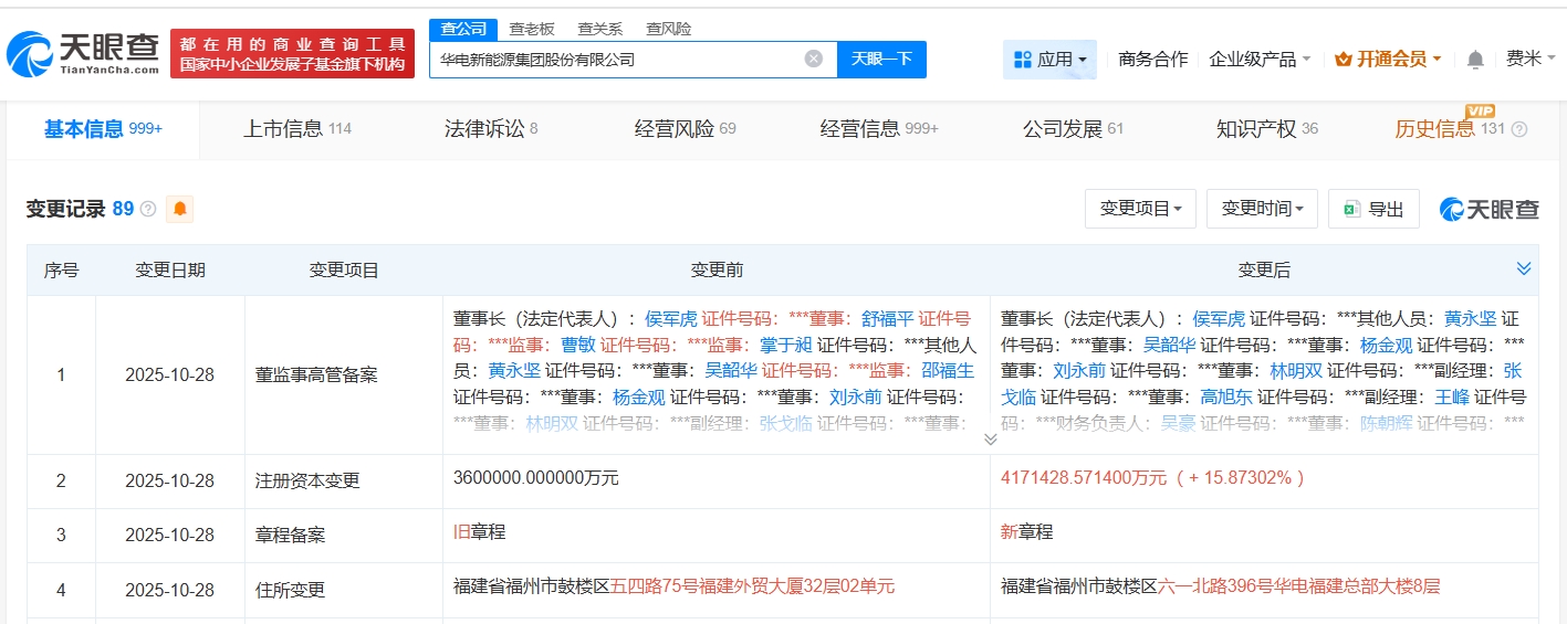雷达财经讯,天眼查App显示,近日,华电新能(600930)发生工商变更,注册资本由360亿人民币增至约417.1亿人民币,增幅约16%。