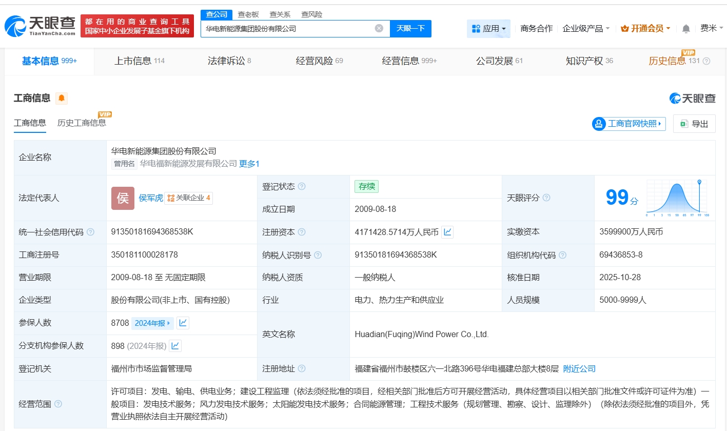 华电新能源集团股份有限公司成立于2009年8月,法定代表人为侯军虎,经营范围包括风力发电技术服务、太阳能发电技术服务、合同能源管理等,由福建华电福瑞能源发展有限公司、华电国际(600027)、中国人寿(601628)等共同持股。