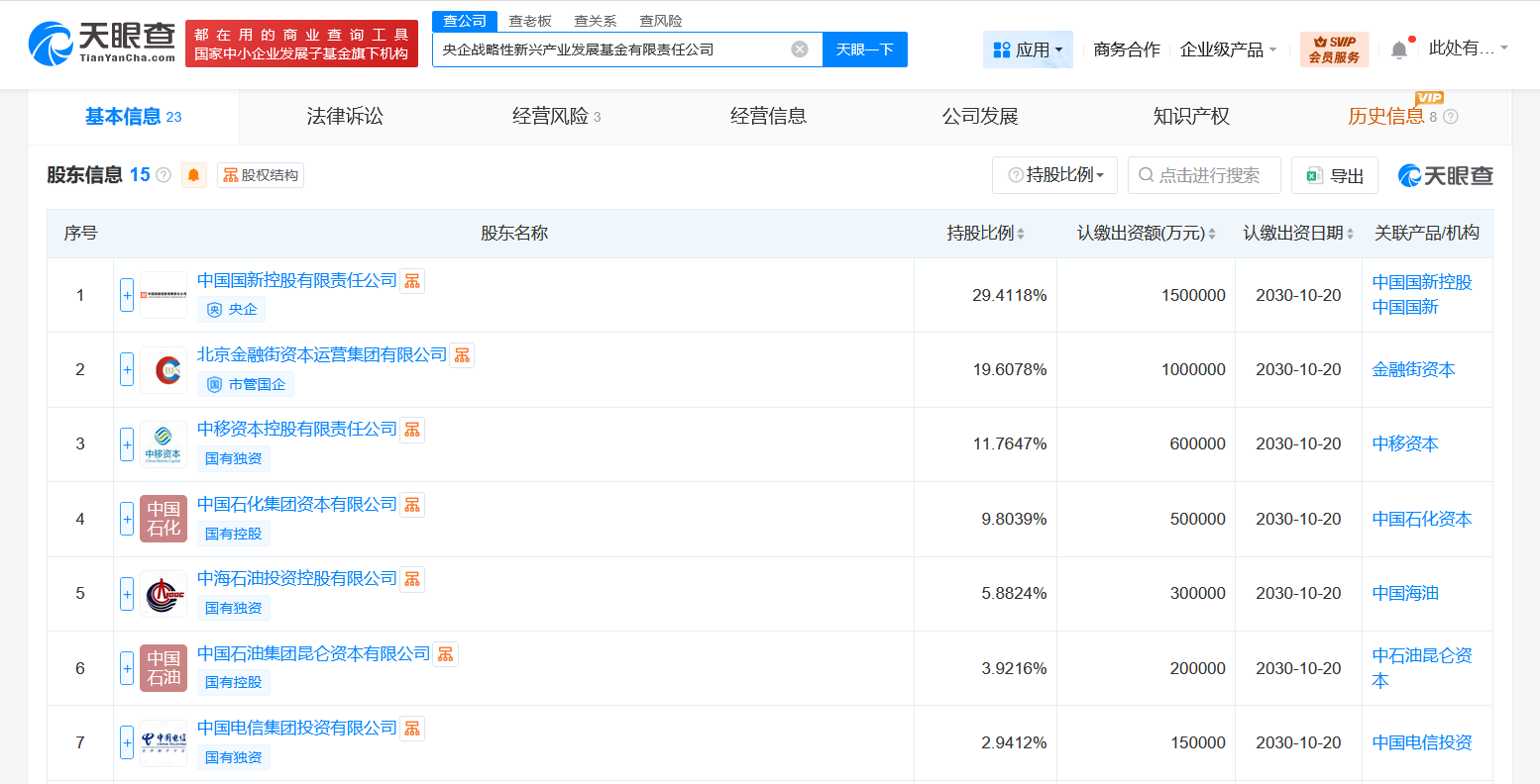 雷达财经讯,天眼查App显示,近日,央企战略性新兴产业发展基金有限责任公司成立,法定代表人为黄杰,注册资本510亿人民币,经营范围为私募股权投资基金管理、创业投资基金管理服务,由中国国新控股有限责任公司、北京金融街资本运营集团有限公司、中移资本控股有限责任公司、中国石化集团资本有限公司、中国石油集团昆仑资本有限公司、中国电信集团投资有限公司等共同持股。