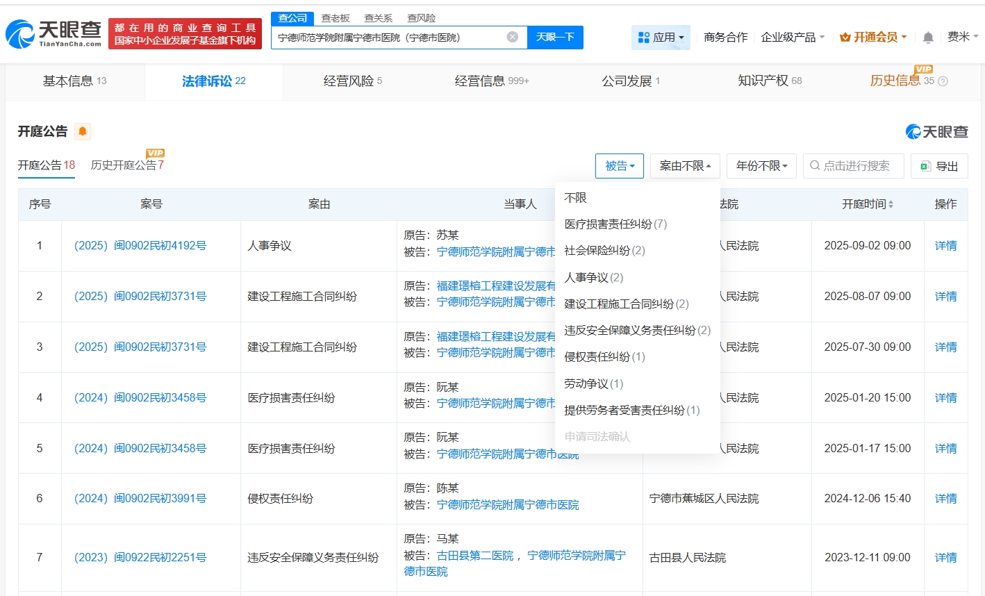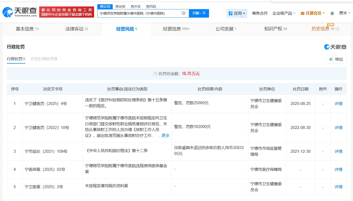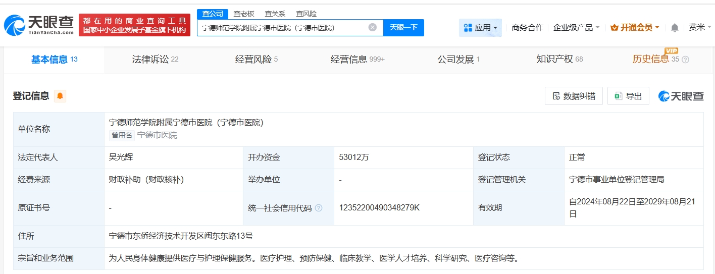 天眼查App显示,涉事医院宁德师范学院附属宁德市医院(宁德市医院)法定代表人为吴光辉,开办资金约5.3亿人民币,宗旨和业务范围为医疗护理、预防保健、临床教学、医学人才培养、科学研究、医疗咨询等。法律诉讼信息显示,该医院曾多次因医疗损害责任纠纷被起诉。经营风险信息显示,今年8月,该医院因未按规定填写病历资料的违法行为,被宁德市卫生健康委员会罚款2.5万元。