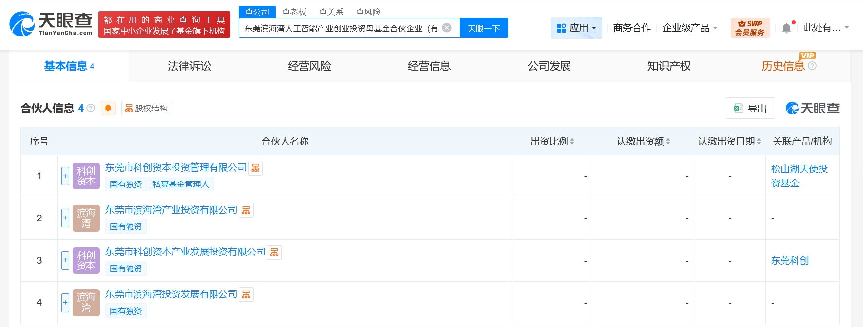雷达财经讯,天眼查App显示,近日,东莞滨海湾人工智能产业创业投资母基金合伙企业(有限合伙)成立,执行事务合伙人为邓恩广,出资额3亿人民币,经营范围为以私募基金从事股权投资、投资管理、资产管理等活动。合伙人信息显示,该基金由东莞市科创资本投资管理有限公司、东莞市滨海湾产业投资有限公司、东莞市科创资本产业发展投资有限公司、东莞市滨海湾投资发展有限公司共同出资。