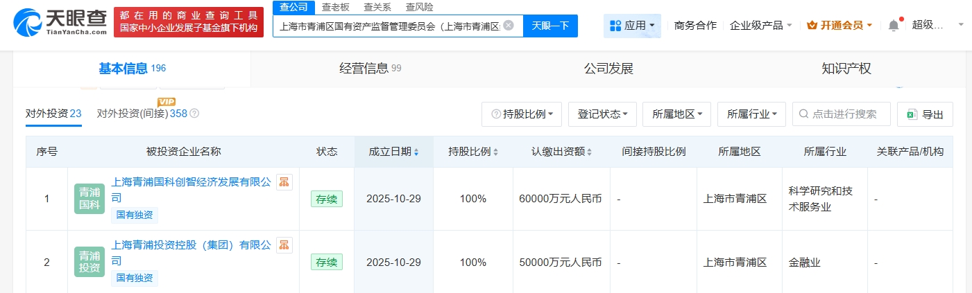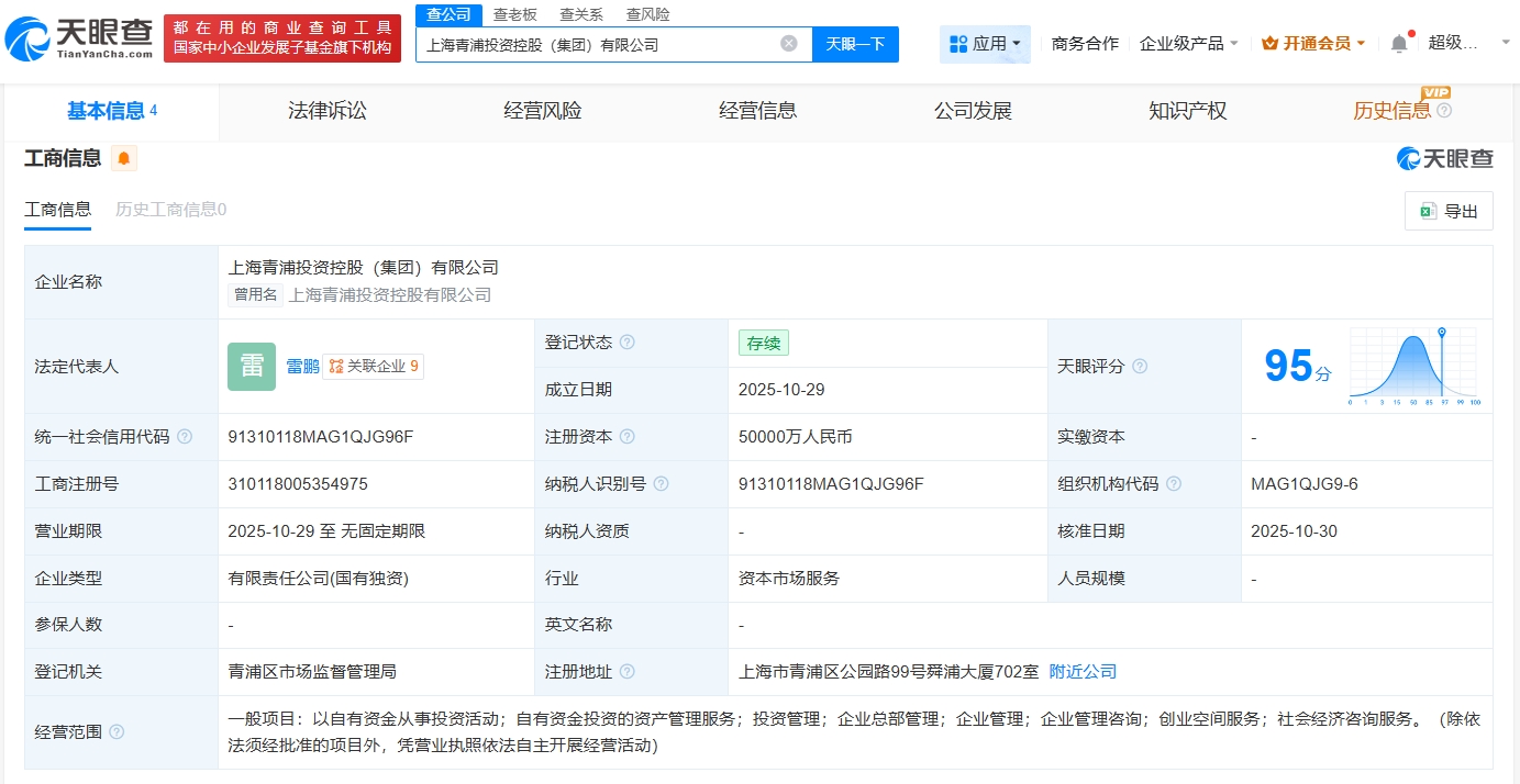 同日,上海青浦投资控股(集团)有限公司成立,法定代表人为雷鹏,注册资本5亿人民币,经营范围包括以自有资金从事投资活动、自有资金投资的资产管理服务、投资管理等,由上海市青浦区国有资产监督管理委员会全资持股。