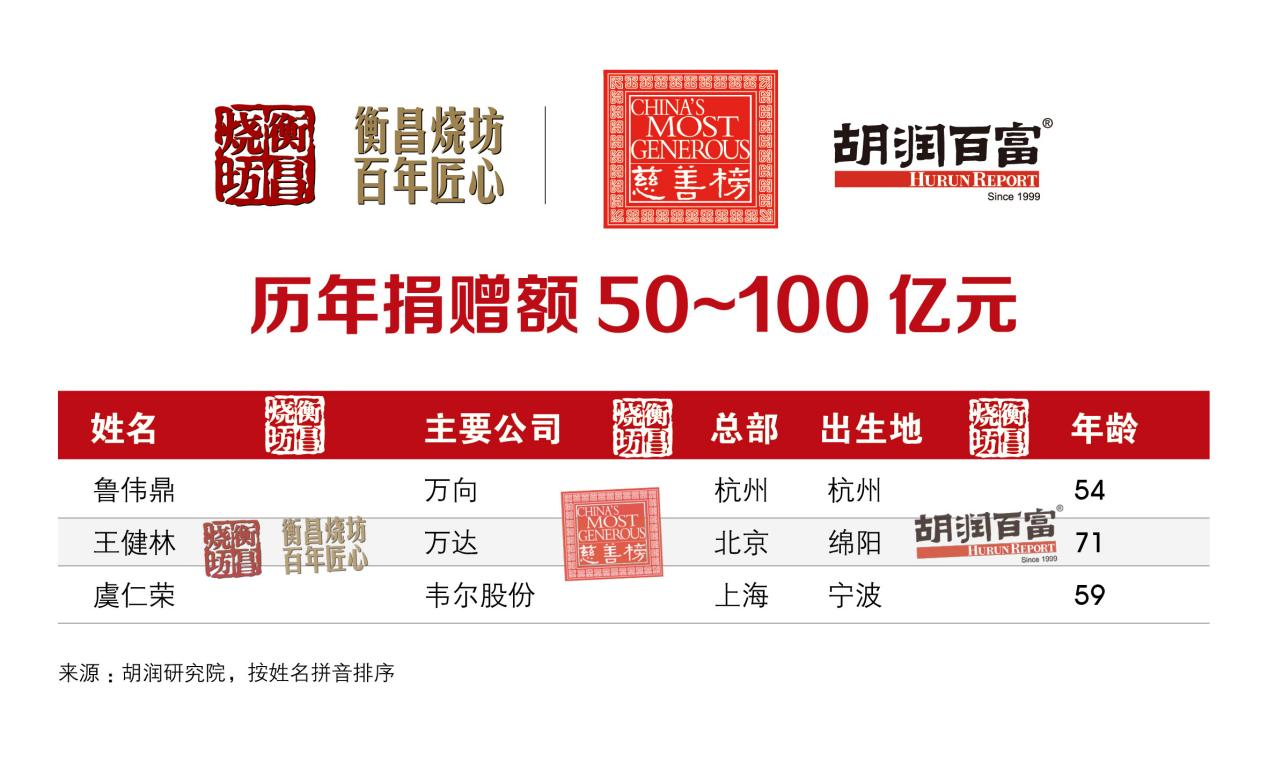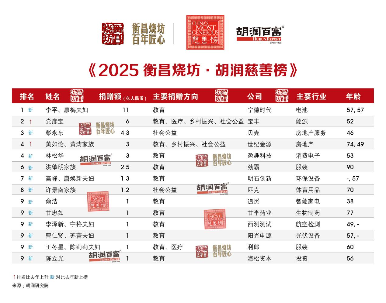 11月4日,胡润研究院发布《2025衡昌烧坊·胡润慈善榜》(HENGCHANG SHAOFANG · Hurun China Philanthropy List 2025)。统计区间为:2024年9月1日至2025年8月31日期间的现金和股权捐赠,以及有法律效力的承诺捐赠都统计在内。2025年8月31日至榜单发布日期间的1亿元以上大额捐赠,也计入本次统计。今年是胡润研究院连续第二十二次发布“胡润慈善榜”。