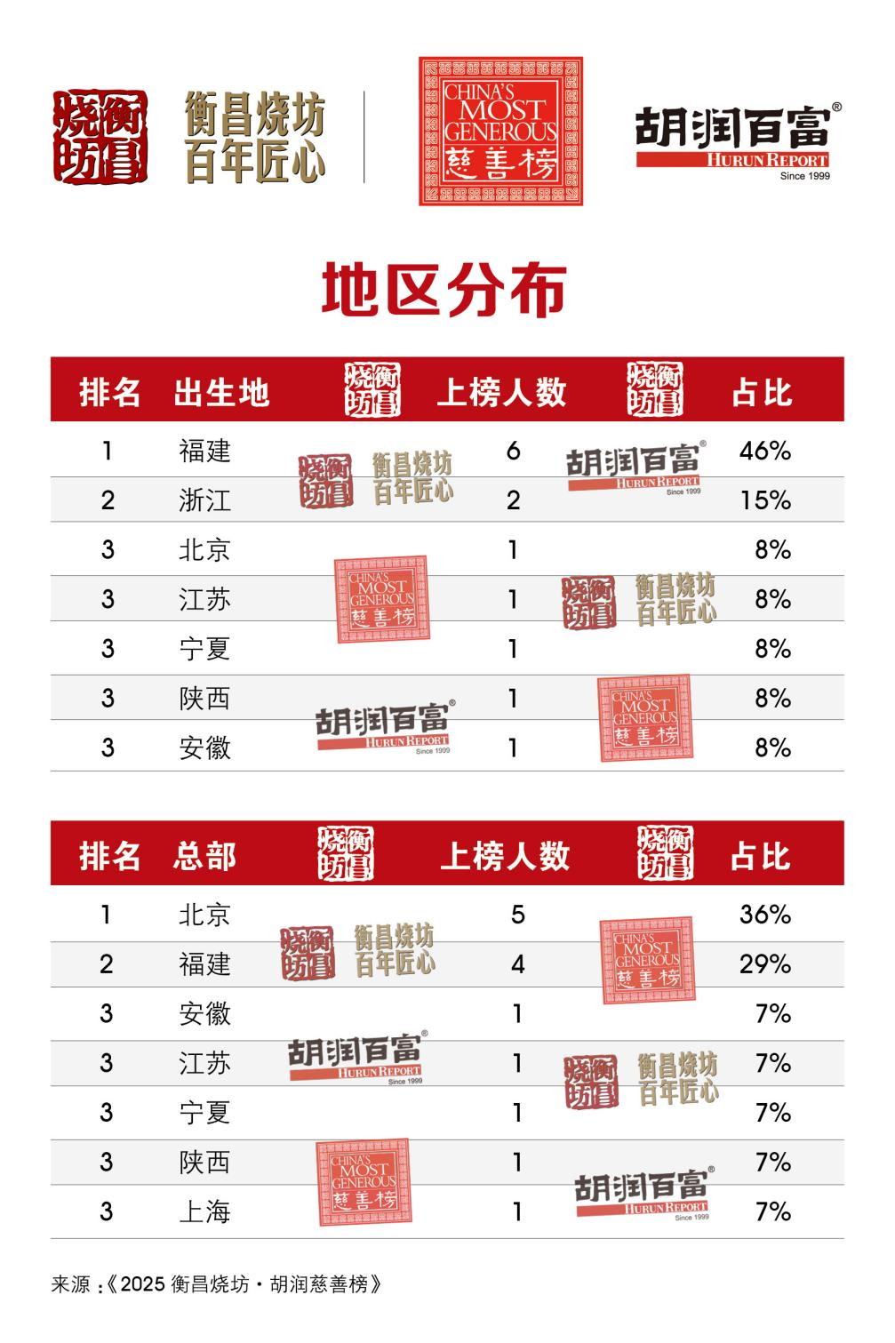 《2025衡昌烧坊·胡润慈善榜》上榜门槛为1亿元人民币。胡润研究院共找到来自9个城市的14位中国最慷慨慈善家过去一年捐赠额都超过1亿元,共计捐赠38.3亿元。教育领域仍是捐赠人数最多的方向,社会公益第二,医疗和乡村振兴并列第三。79%的上榜慈善家以个人或家族名义捐赠,比去年增加7%;以企业名义捐赠的占比21%。64%的上榜慈善家来自上市公司,比去年提高14%。上榜慈善家平均年龄59岁,与去年持平。其中,阳光电源的曹仁贤是第十四届全国人大代表。5位女性慈善家上榜,与去年人数持平。