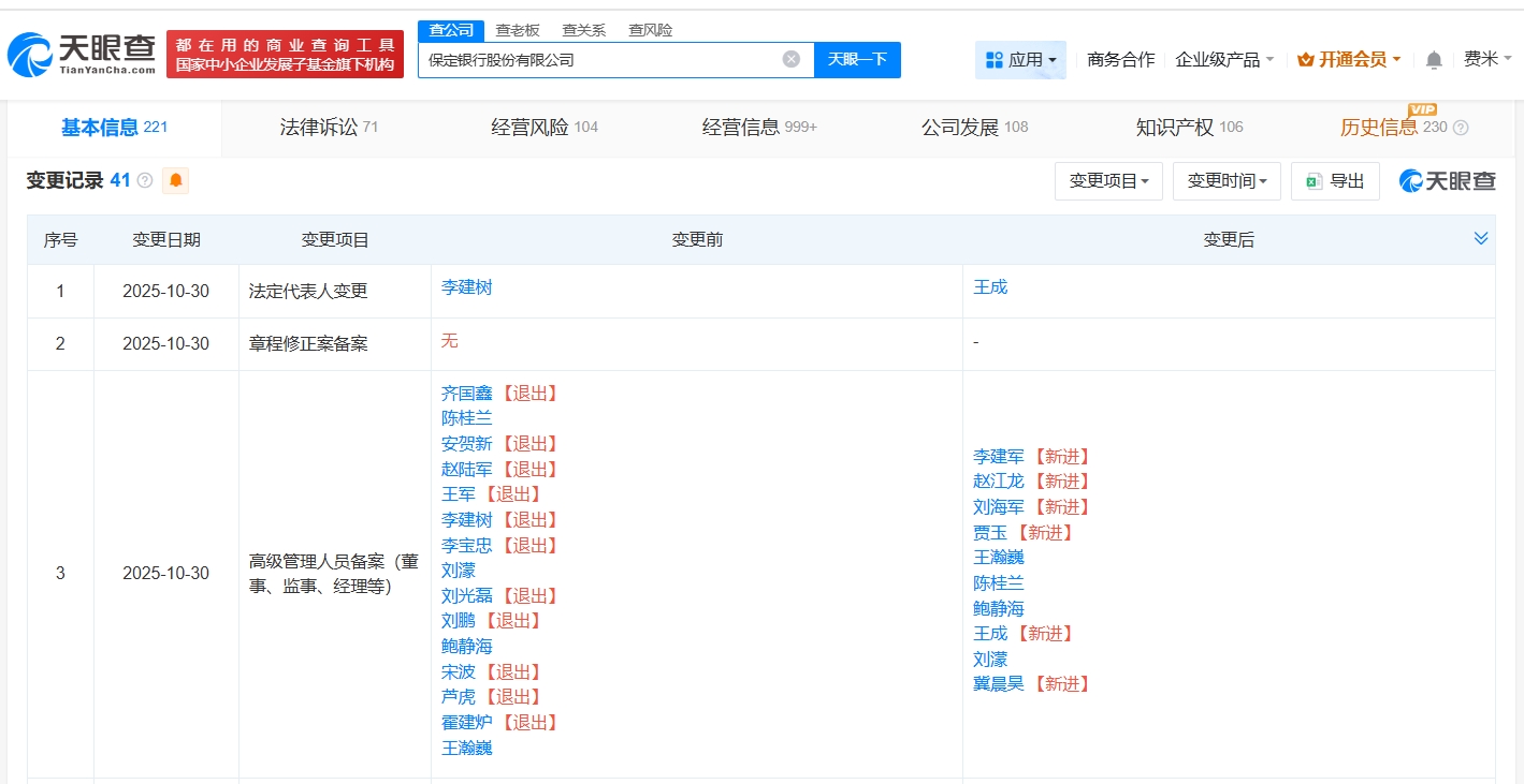 雷达财经讯,天眼查工商信息显示,近日,保定银行股份有限公司发生工商变更,李建树卸任法定代表人、董事长,由王成接任,同时多位主要人员发生变更。