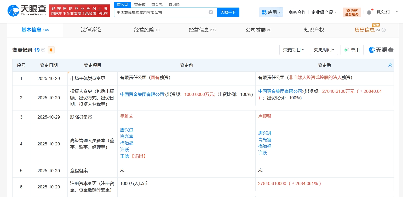 雷达财经讯,天眼查工商信息显示,近日,中国黄金集团贵州有限公司发生工商变更,注册资本由1000万人民币增至约2.8亿人民币,增幅约2684%。