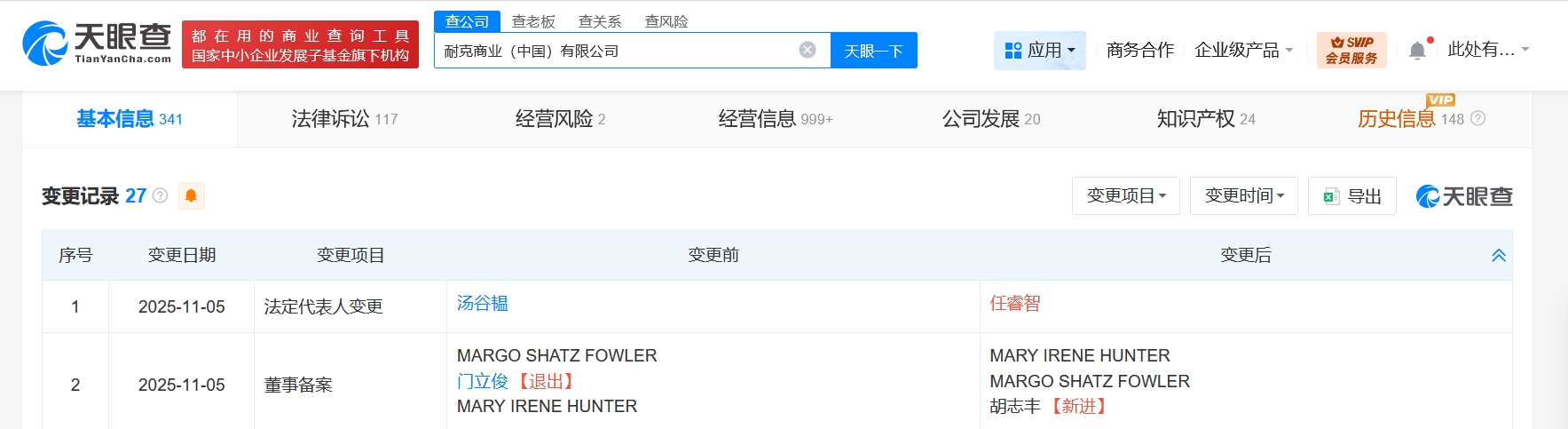 雷达财经讯,天眼查工商信息显示,近日,耐克商业(中国)有限公司发生工商变更,汤谷韫卸任法定代表人、总经理,由任睿智接任法定代表人并担任经理,门立俊卸任董事长,由胡志丰接任。