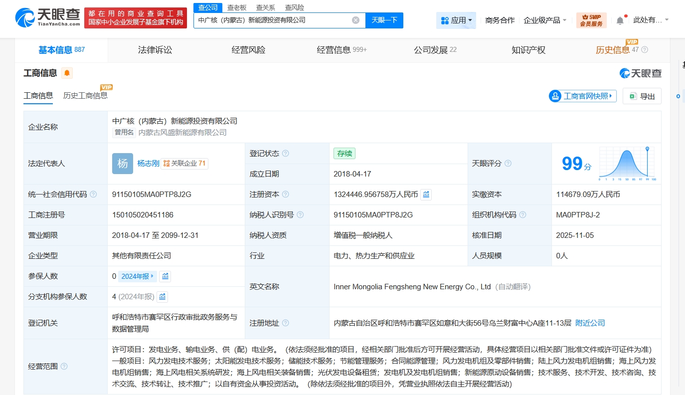 中广核(内蒙古)新能源投资有限公司成立于2018年4月,法定代表人为杨志刚,经营范围含发电业务、输电业务、供(配)电业务,风力发电技术服务,太阳能发电技术服务,储能技术服务,节能管理服务,合同能源管理,风力发电机组及零部件销售,光伏发电设备租赁,发电机及发电机组销售等。股东信息显示,该公司现由中广核风电有限公司及上述新增股东等共同持股。