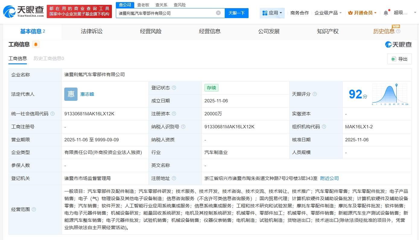 利氪科技在诸暨成立汽车零部件公司 注册资本2亿
