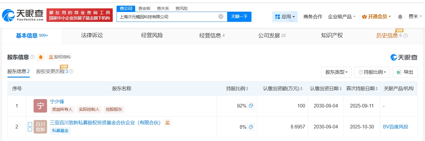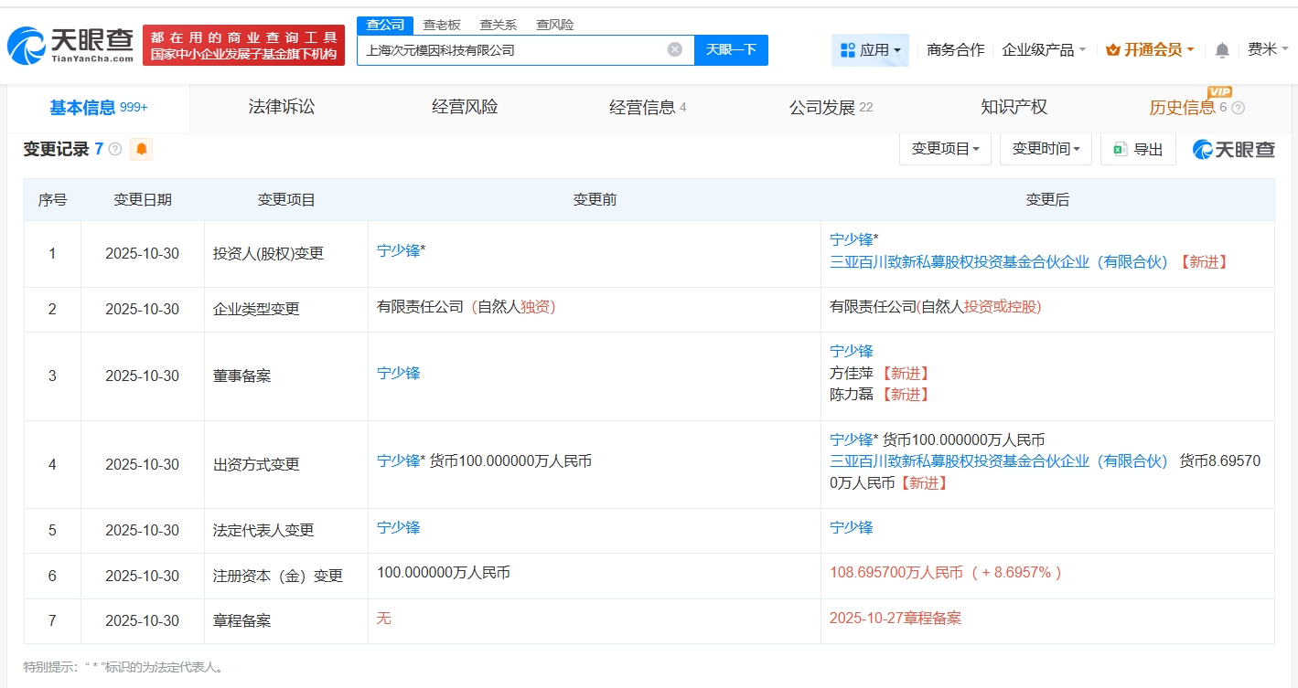 上海次元模因科技有限公司成立于今年9月,法定代表人为宁少锋,经营范围包括电影摄制服务、动漫游戏开发、广告制作等。股东信息显示,该公司现由宁少锋及上述新增股东共同持股。公开资料显示,该公司致力于通过 AI技术降低动画创作门槛,为内容创作者提供更便捷、高效的创作工具。