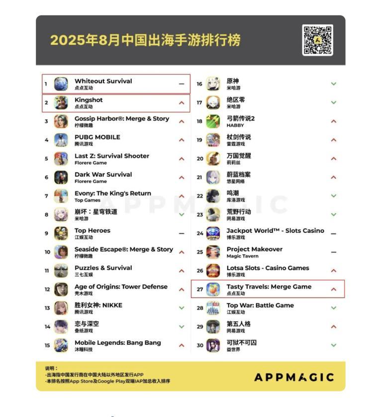 9月9日,AppMagic发布了2025年8月中国出海手游排行榜,点点互动旗下CenturyGames的两款产品《WhiteoutSurvival》和《Kingshot》稳居榜单冠亚军,“双雄霸榜”之势已稳固成型。