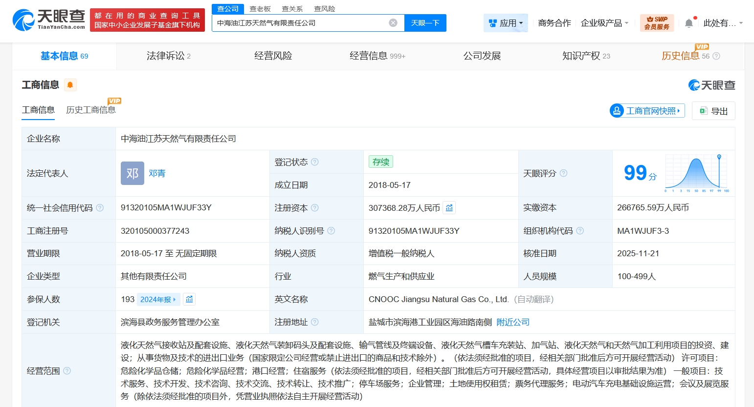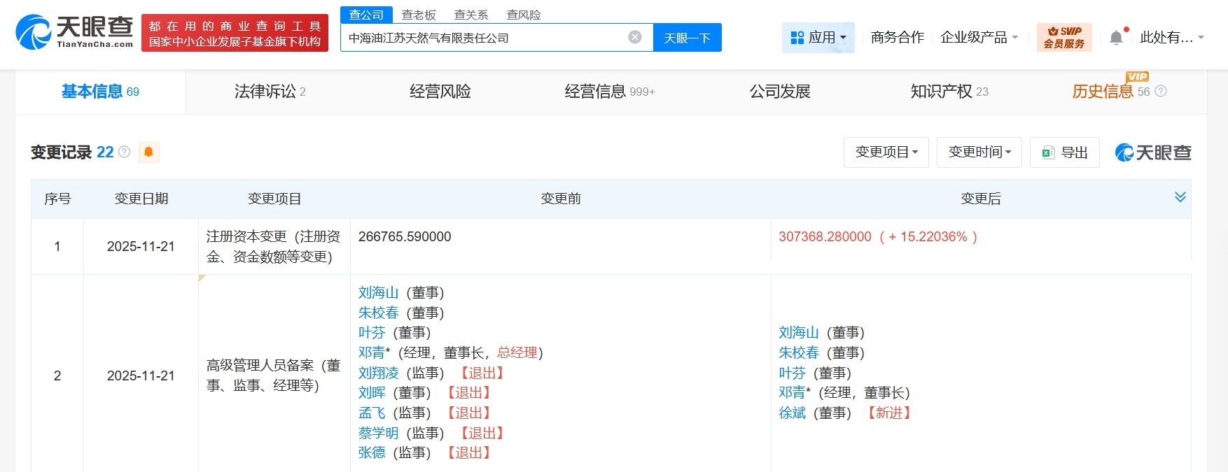 雷达财经讯,天眼查工商信息显示,近日,中海油江苏天然气有限责任公司发生工商变更,注册资本由约26.7亿人民币增至约30.7亿人民币,增幅约15%,同时,多位高管发生变更。