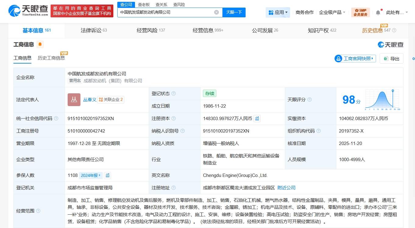 中国航发成都发动机有限公司成立于1986年11月,法定代表人为丛春义,经营范围含制造、加工、销售、修理航空发动机及售后服务,公共安全设备、器材及技术开发、技术服务、技术咨询等。股东信息显示,该公司由中国航空发动机集团有限公司、成都先进制造产业投资有限公司及上述新增股东等共同持股。