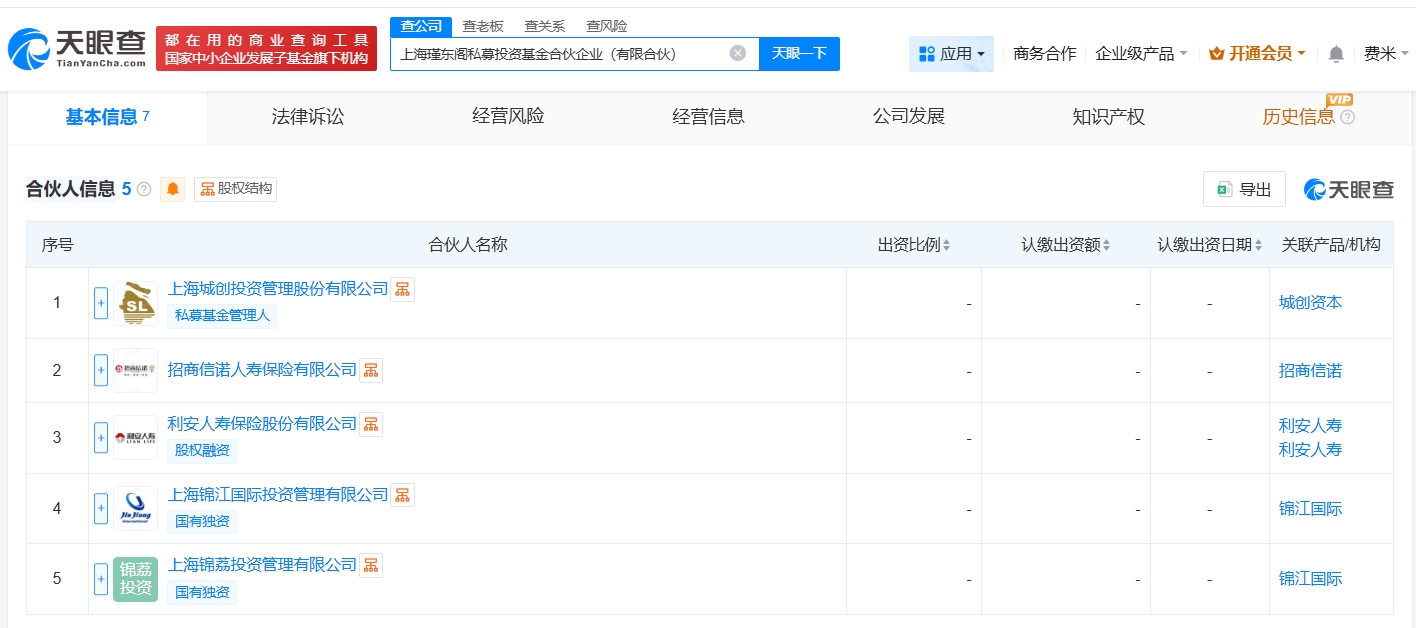 雷达财经讯,天眼查工商信息显示,近日,上海瑾东阁私募投资基金合伙企业(有限合伙)成立,出资额约9亿人民币,经营范围为以私募基金从事股权投资、投资管理、资产管理等活动。合伙人信息显示,该基金由上海城创投资管理股份有限公司、招商信诺人寿保险有限公司、利安人寿保险股份有限公司、上海锦江国际投资管理有限公司、上海锦荔投资管理有限公司共同出资。