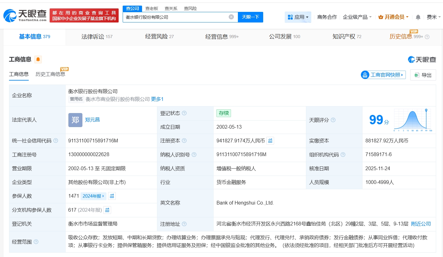雷达财经讯,天眼查工商信息显示,近日,衡水银行股份有限公司发生工商变更,注册资本由约88.2亿人民币增至约94.2亿人民币,增幅约7%。