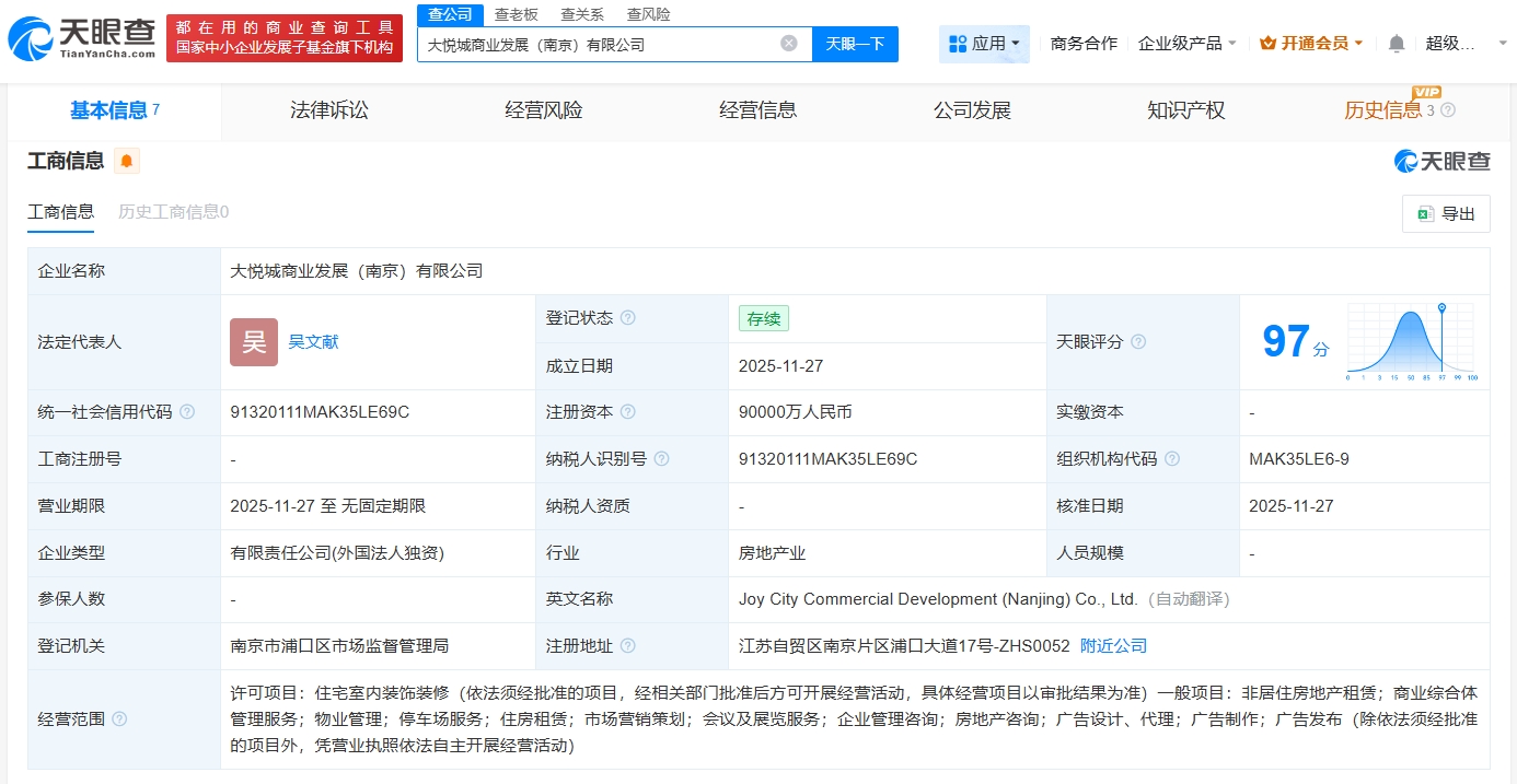 雷达财经讯,天眼查App显示,近日,大悦城商业发展(南京)有限公司成立,法定代表人为吴文献,注册资本9亿人民币,经营范围包括非居住房地产租赁、商业综合体管理服务、物业管理、市场营销策划等。股东信息显示,该公司由JOY CITY PROPERTY LIMITED全资持股。