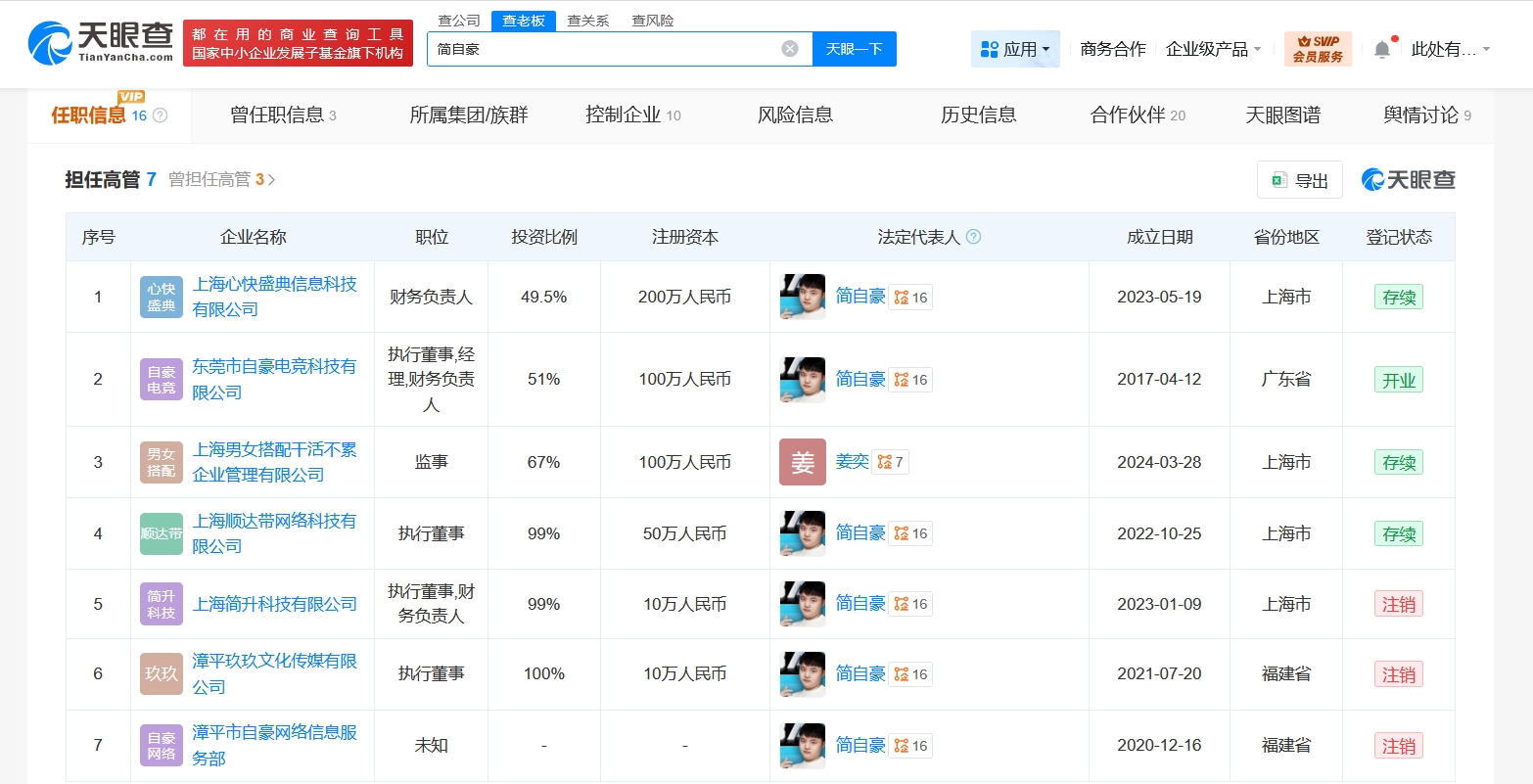 天眼查App显示,简自豪名下关联16家企业,其中4家为存续或开业状态,包括上海心快盛典信息科技有限公司、东莞市自豪电竞科技有限公司、上海男女搭配干活不累企业管理有限公司、上海顺达带网络科技有限公司,简自豪在上述公司中担任执行董事、经理、财务负责人等职务,并持有多家公司股份。