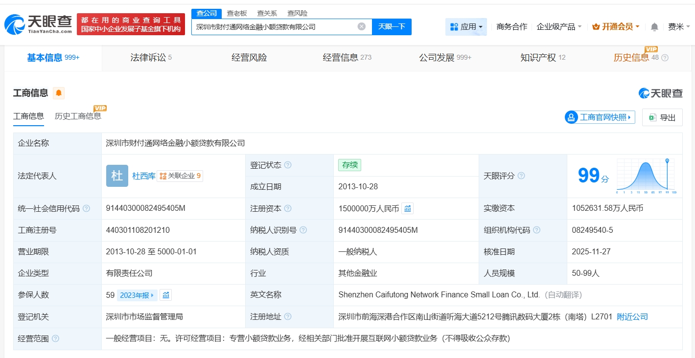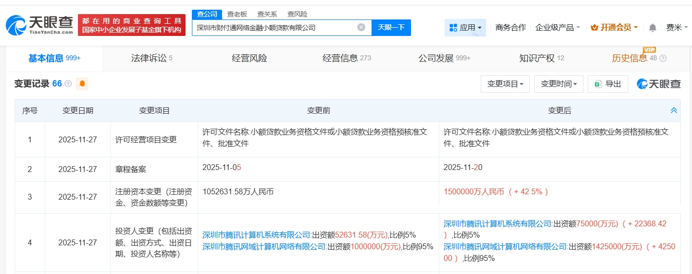 雷达财经讯,天眼查工商信息显示,近日,财付通小贷关联公司深圳市财付通网络金融小额贷款有限公司发生工商变更,注册资本由约105.3亿人民币增至150亿人民币,增幅42.5%。