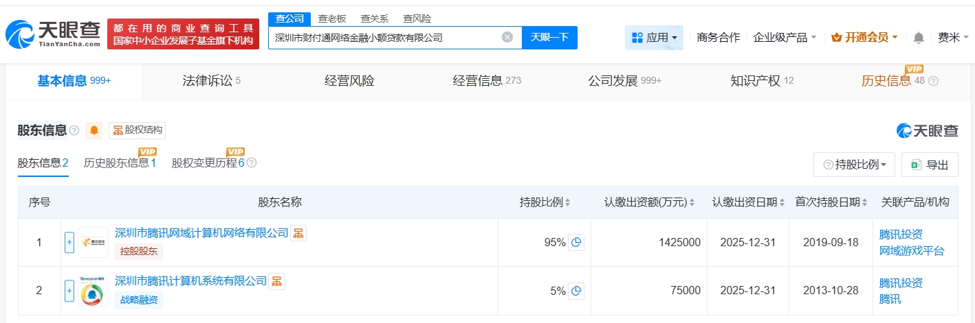 该公司成立于2013年10月,法定代表人为杜西库,经营范围为专营小额贷款业务,经相关部门批准开展互联网小额贷款业务,由深圳市腾讯网域计算机网络有限公司、深圳市腾讯计算机系统有限公司共同持股。