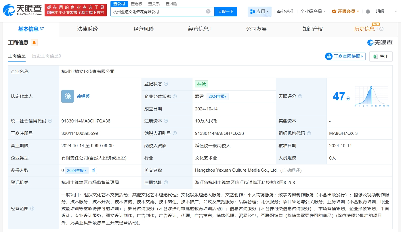 值得注意的是,杭州业煊文化传媒有限公司成立于2024年10月,法定代表人、董事、经理为徐锡英,注册资本10万人民币,经营范围包括组织文化艺术交流活动、其他文化艺术经纪代理、文化娱乐经纪人服务等,由张蕊和徐锡英分别持股80%、20%。