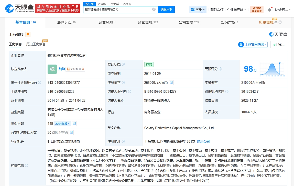 该公司成立于2014年4月,法定代表人为魏峰,经营范围含投资管理、企业管理咨询、以自有资金从事投资活动、货物进出口、金银制品销售、金属材料销售、再生资源销售等。股东信息显示,该公司由中国银河(601881)旗下银河期货有限公司全资持股。