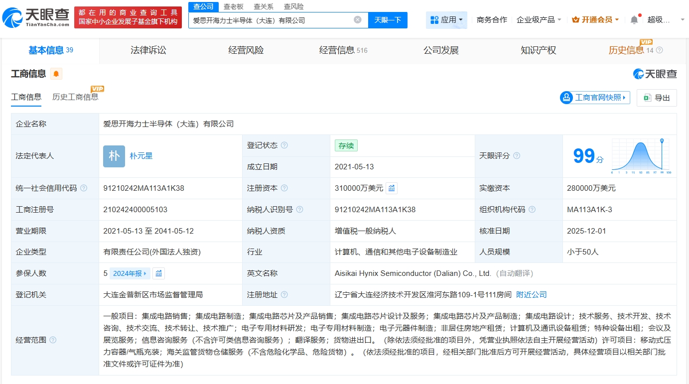 该公司成立于2021年5月,法定代表人为朴元星,经营范围含集成电路销售与制造、电子专用材料研发、信息咨询服务、货物进出口等。股东信息显示,该公司由SK海力士株式会社全资持股。