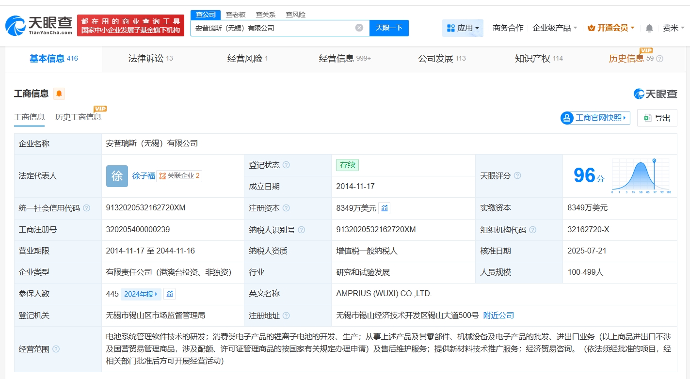安普瑞斯(无锡)有限公司成立于2014年11月,法定代表人为徐子福,注册资本8349万美元,经营范围包括电池系统管理软件技术的研发、提供新材料技术推广服务、经济贸易咨询等,由无锡产业发展集团有限公司及安普瑞斯(香港-2)有限公司(AMPRIUS(HONG KONG-2) LIMITED)共同持股。
