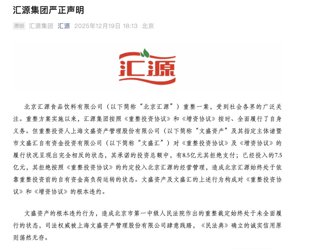 “承诺的投资总额中,有8.5亿元其拒绝支付;已经投入的7.5亿元,其拒绝按照约定投入经营管理。”12月19日,汇源集团通过官方渠道发布《严正声明》,以罕见的强硬措辞,直指其重整投资人上海文盛资产管理股份有限公司(下称“文盛资产”)及文盛汇(文盛资产参与北京汇源重整专门设立的持股平台公司)“根本违约”,甚至指控其行为“涉嫌合同诈骗罪”。