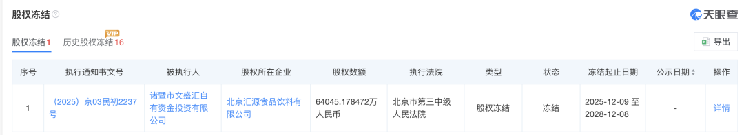 天眼查显示,早在12月9日,文盛汇持有的北京汇源6.4亿元股权已被北京市第三中级人民法院冻结。