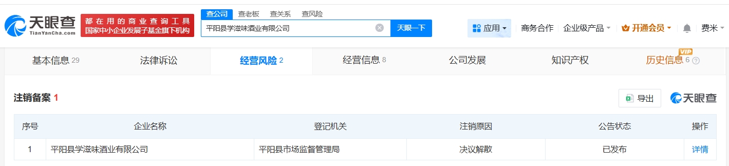 雷达财经讯,天眼查经营风险信息显示,近日,平阳县学滋味酒业有限公司新增一条注销备案公告,注销原因为决议解散,公告期为2025年12月29日至2026年2月11日。