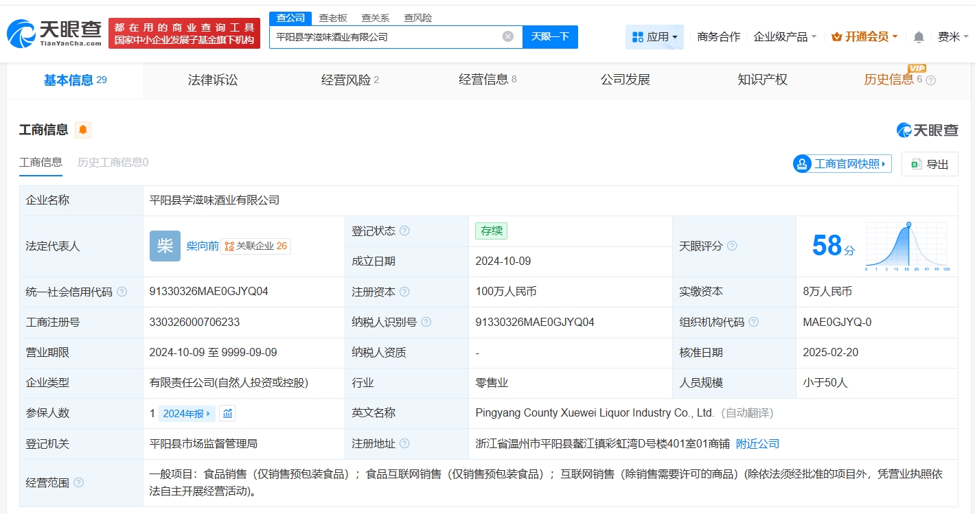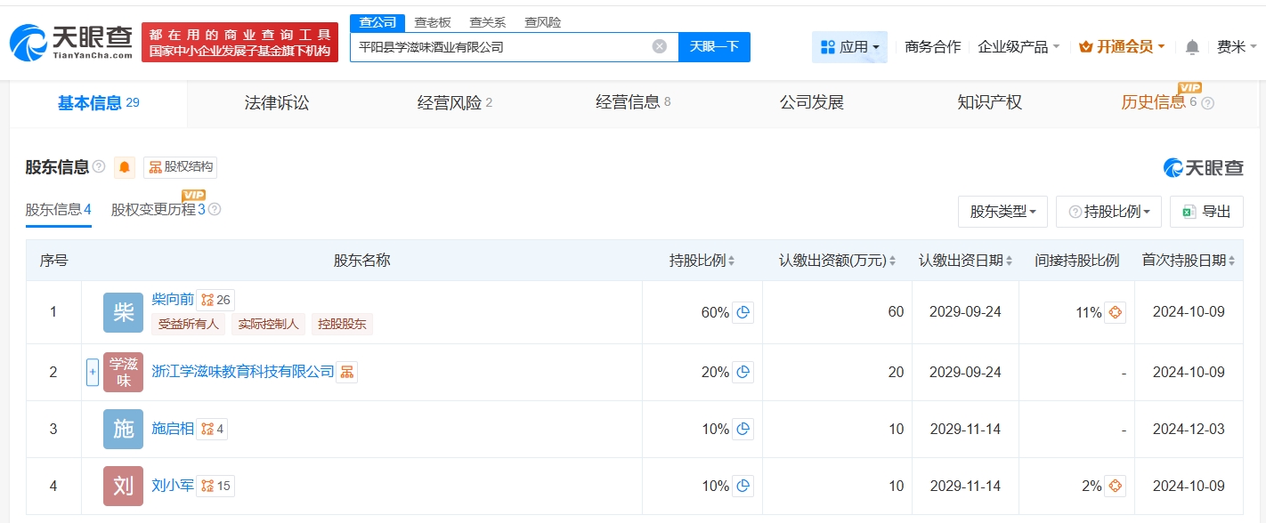 该公司成立于2024年10月,法定代表人为柴向前(柴怼怼),注册资本100万人民币,经营范围为食品销售、食品互联网销售、互联网销售,由柴向前、浙江学滋味教育科技有限公司等共同持股,其中柴向前持股比例为60%。